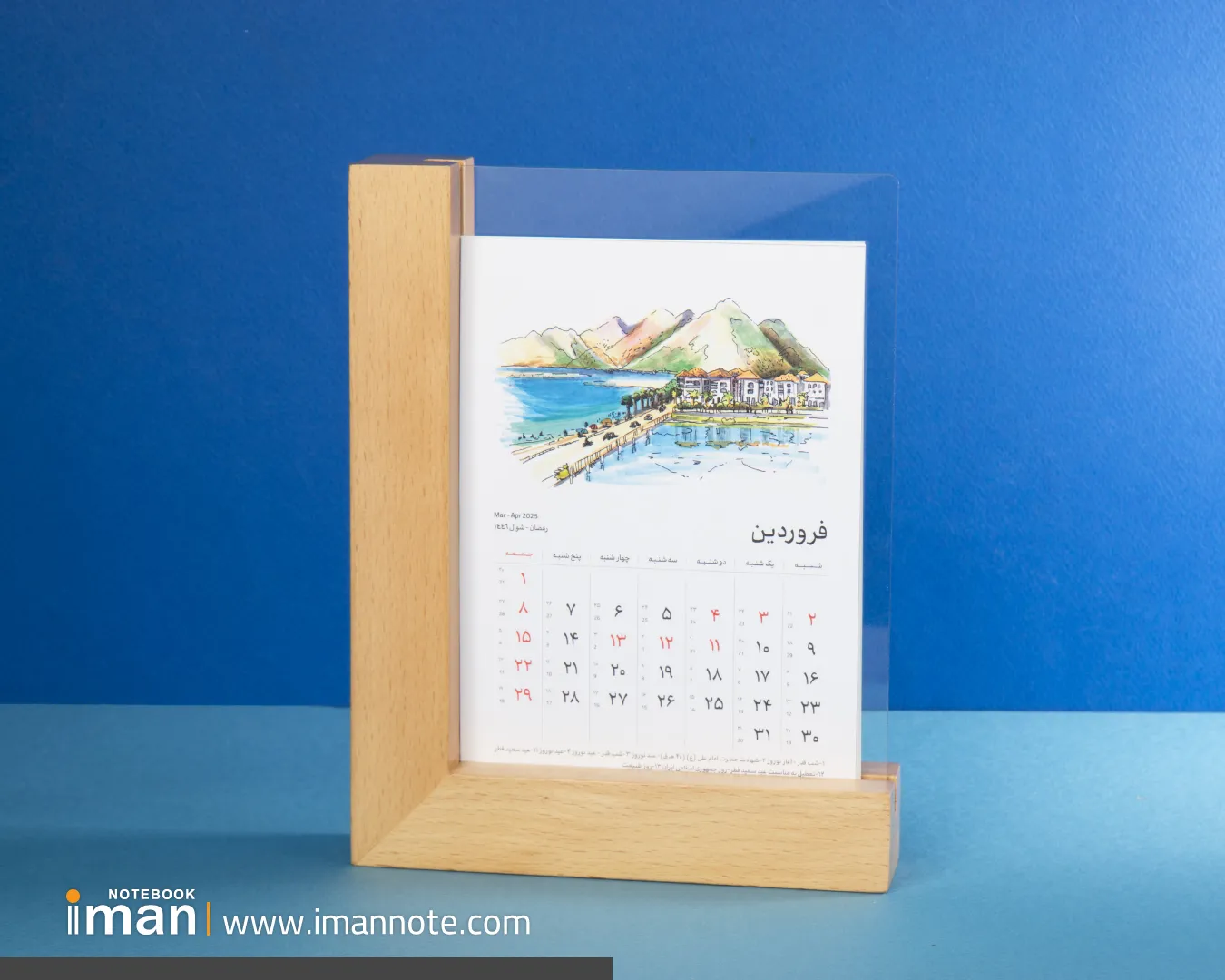 تقویم رومیزی دانژه1404، شامل تقویم و پایه چوبی است.این محصول در رنگ چوب و پلکسی عرضه میشود و از فضای خوبی برای تبلیغ برخوردار است.